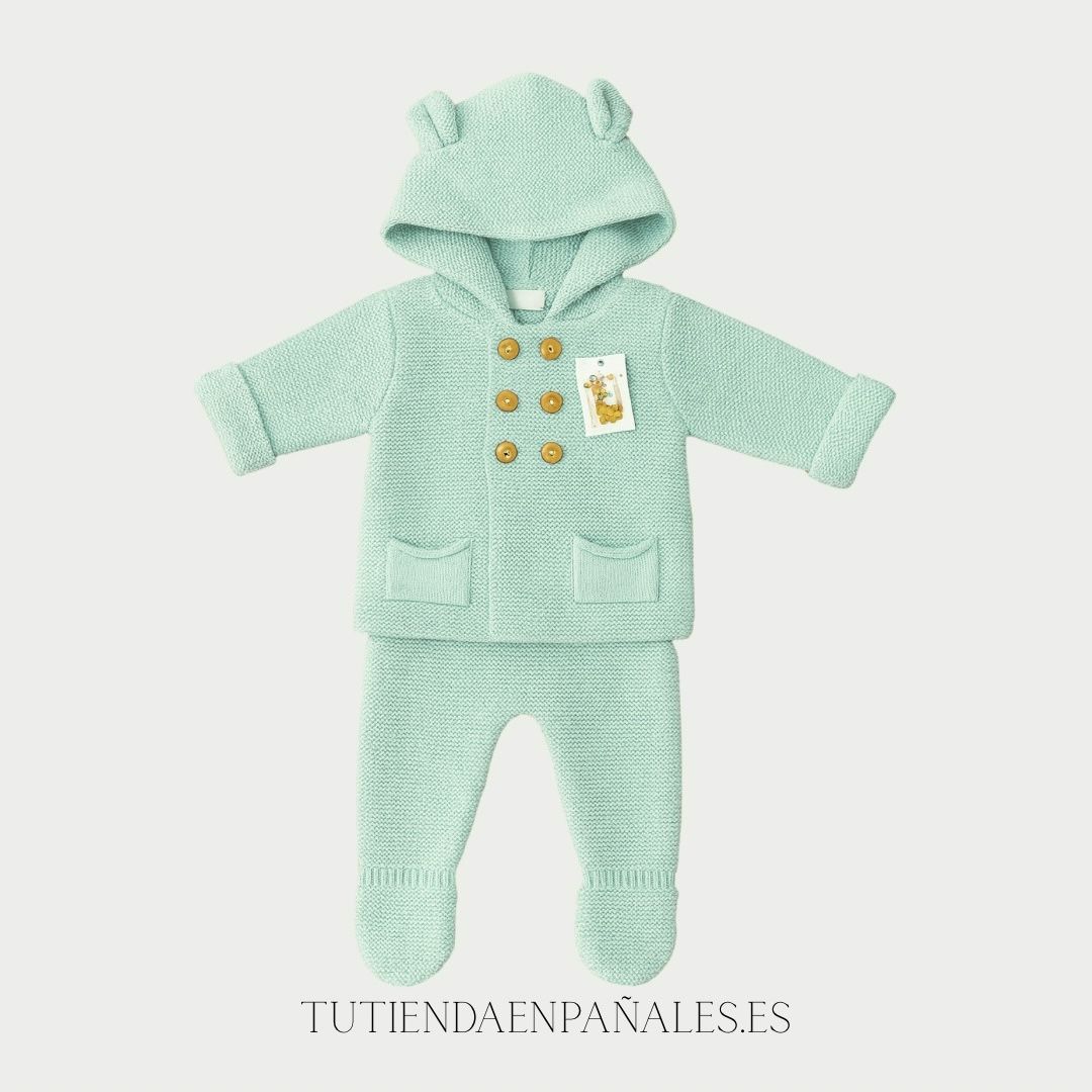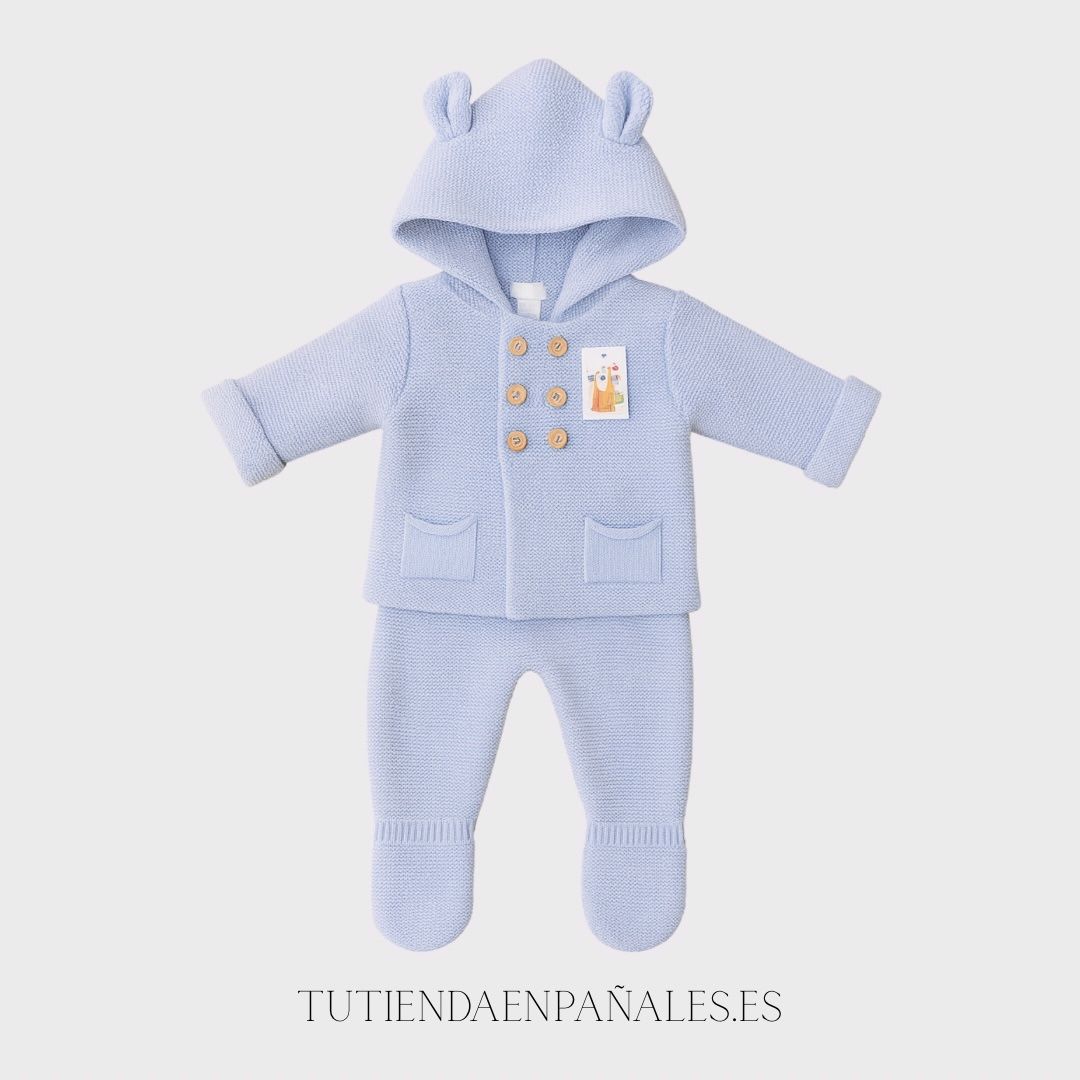Conjunto capucha de lana doble compuesto por chaqueta con capucha y polainas. Disponible desde la talla 3 a 12 meses.