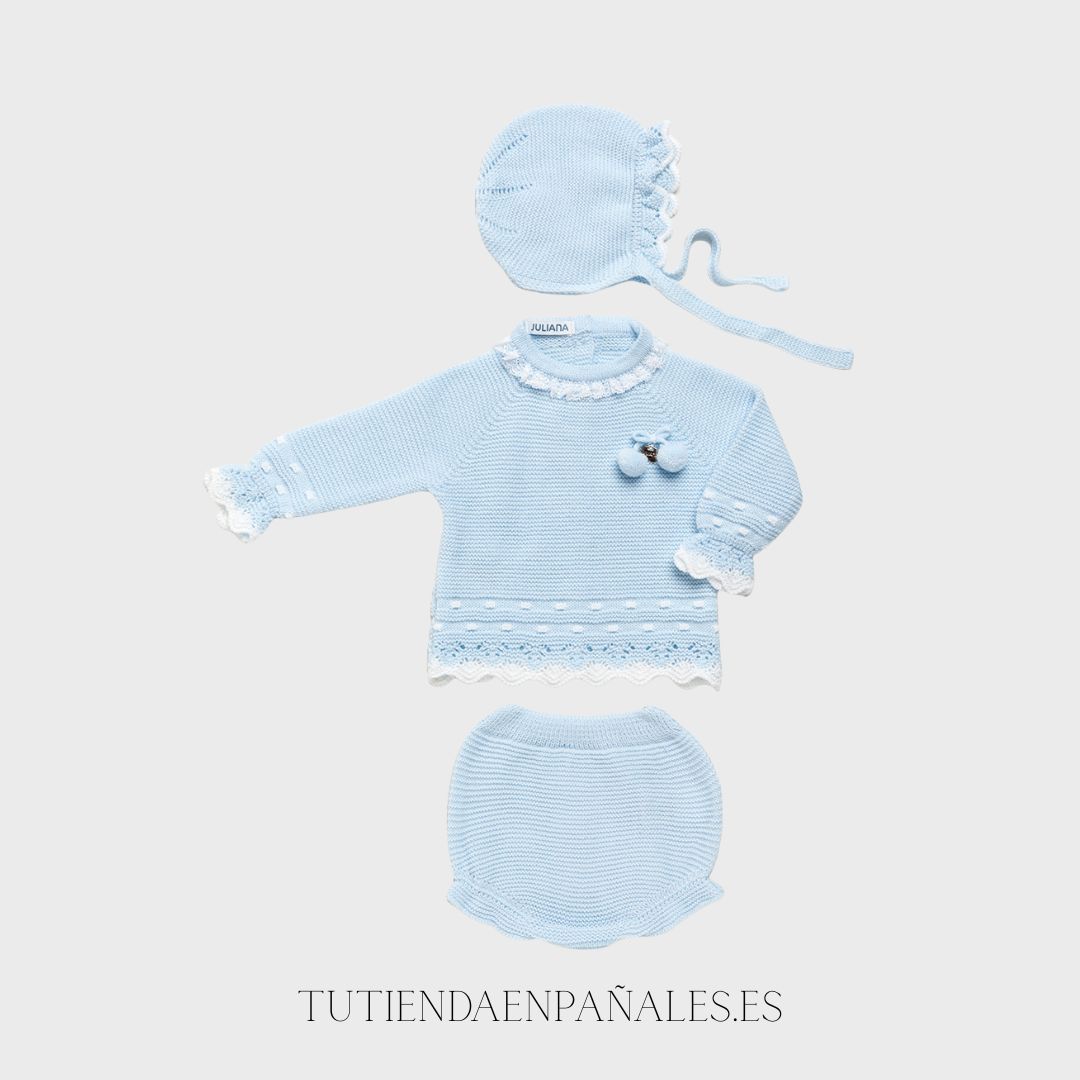 Este delicado conjunto de punto de la marca Juliana está diseñado para envolver al bebé en suavidad y estilo desde sus primeros días. Incluye tres piezas coordinadas que combinan tradición y encanto: