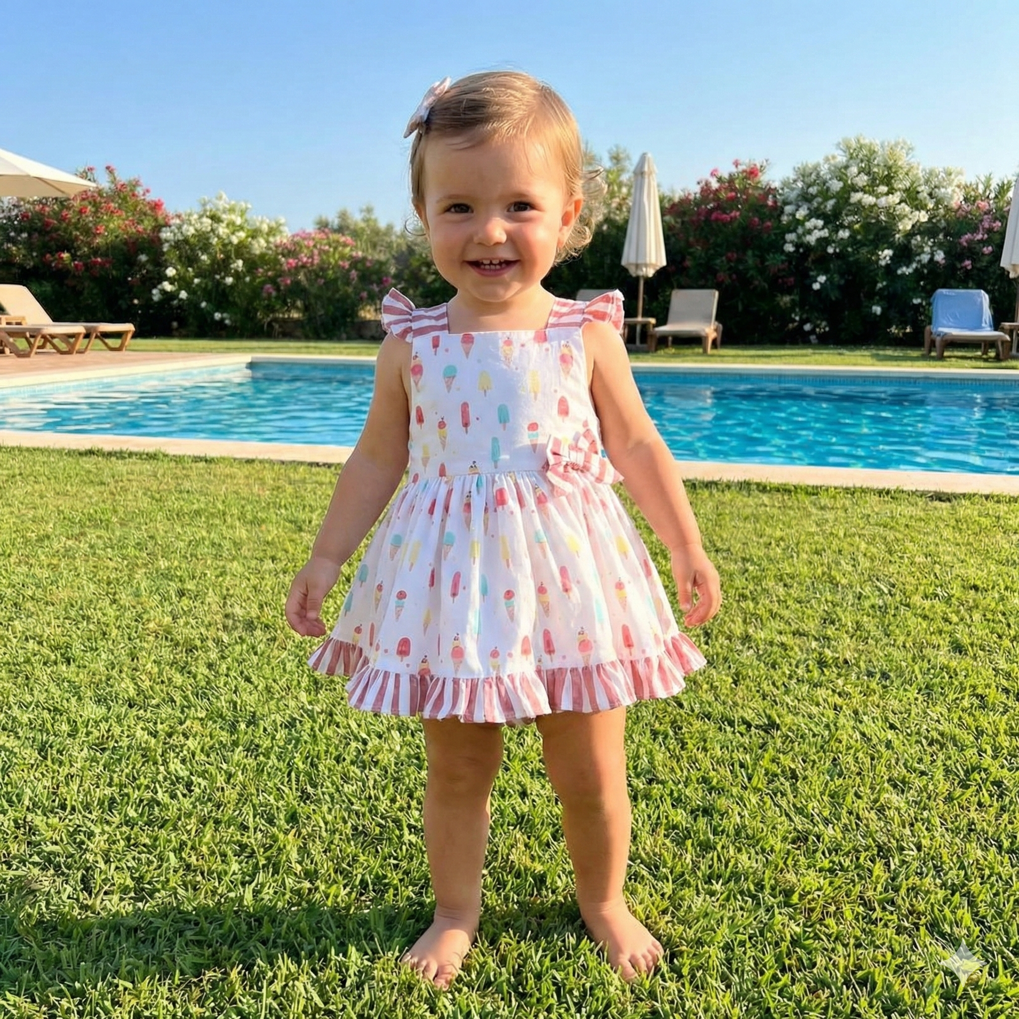 Este encantador conjunto de jesusín y braga de la marca Creaciones Tony es perfecto para la temporada de Primavera/Verano. El diseño presenta un fresco y alegre estampado de helados en tonos pastel (rosa, azul, amarillo) sobre un fondo blanco. El jesusín cuenta con tirantes y volantes en el bajo y en el escote, todos confeccionados en una tela a rayas rojas y blancas que aporta un toque clásico y marinero. La espalda se cierra con botones para facilitar el vestir. La braga a juego, también con el estampado de helados y volantes a rayas, completa el conjunto con comodidad.