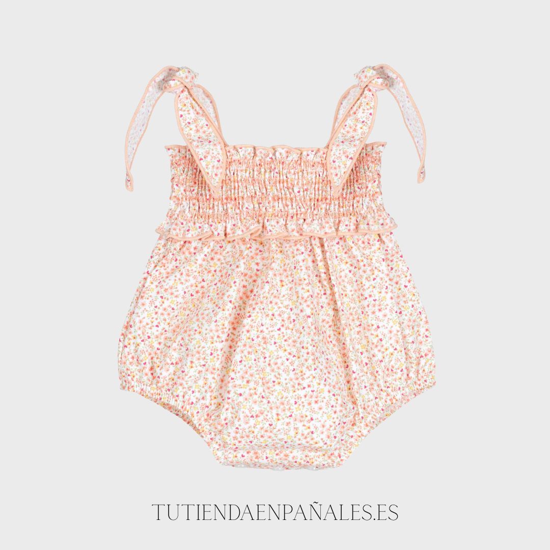 Keywords clave: Ranita bebé niña, ropa flores Liberty, bombacho niña verano, Calamaro Baby online, moda infantil española, peto corto flores.